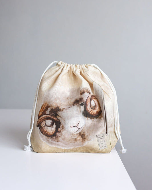 Linen project bag, Knitting needle holder, Knitting Project Bag. Drawstring. Sheep print
