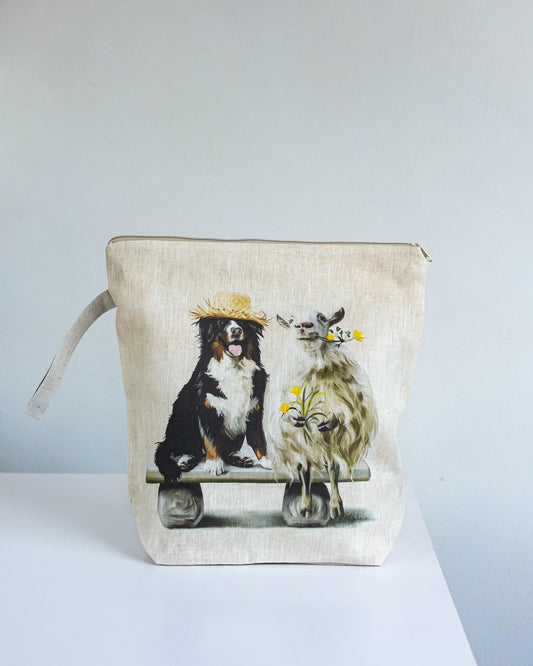 Sheep and Bernie dog print bag. Work in progress Project Bag with zipper. Small, Medium or Large Yarn organizer